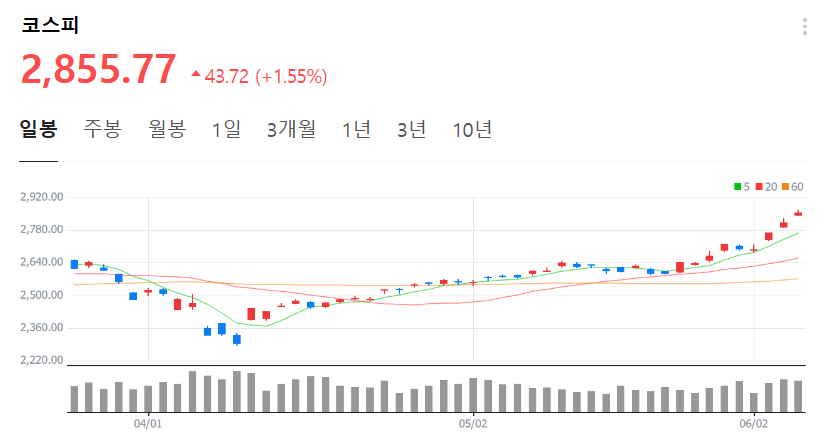 ✅ 2025년 6월 9일, 코스피 2,855.77로 마감하며 2,800선 안착